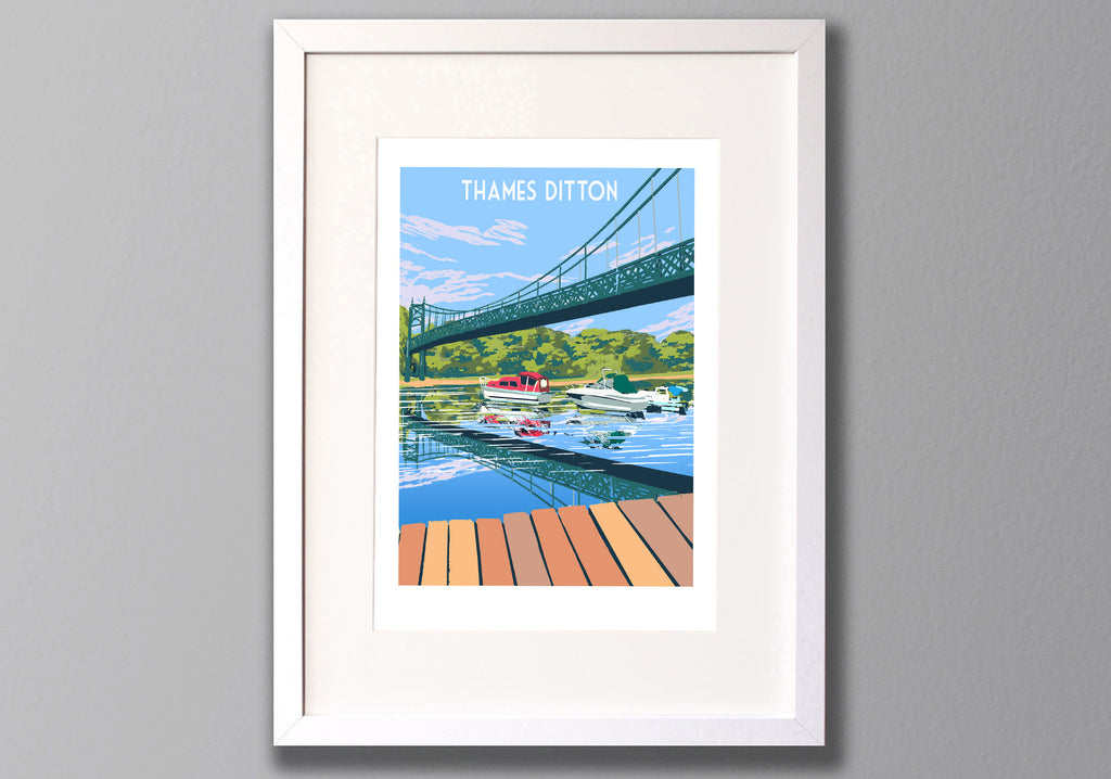 Limited edition travel poster print depicting the footbridge crossing over the Thames to Thames Ditton island from Ye Olde Swan pub.. Makes a thoughtful souvenir for any local to celebrate their area.