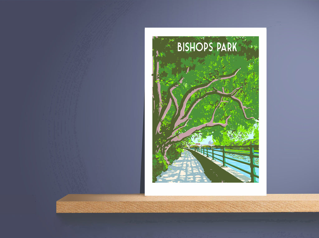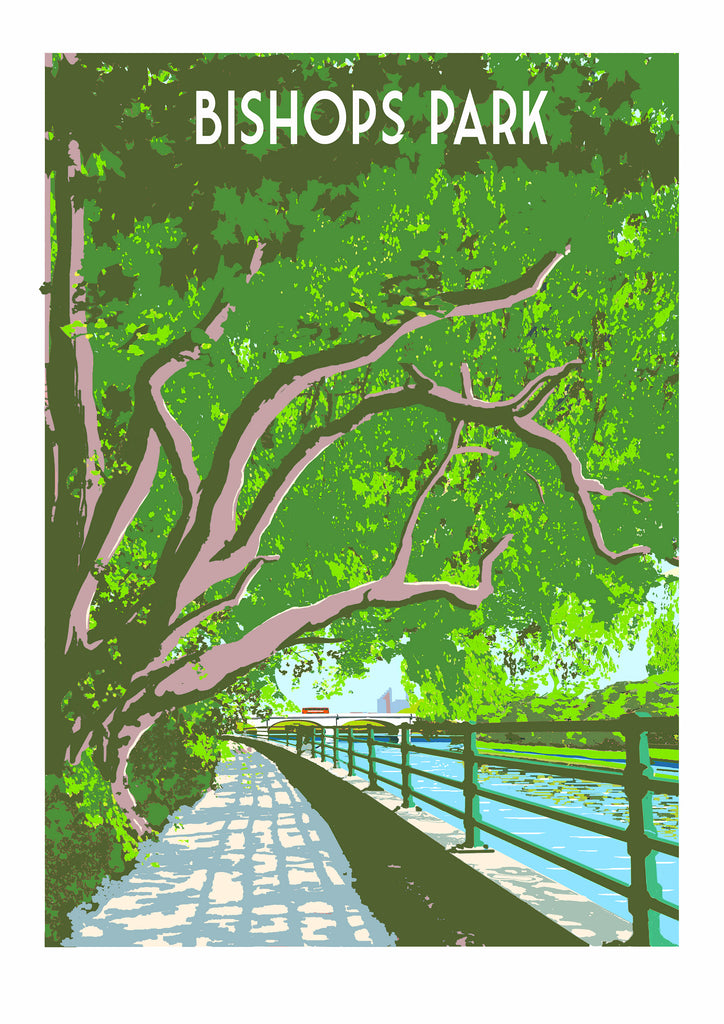 A vibrant green illustration of Bishop's Park by the riverside in Fulham, featuring Putney Bridge beside the grounds of Fulham Palace.