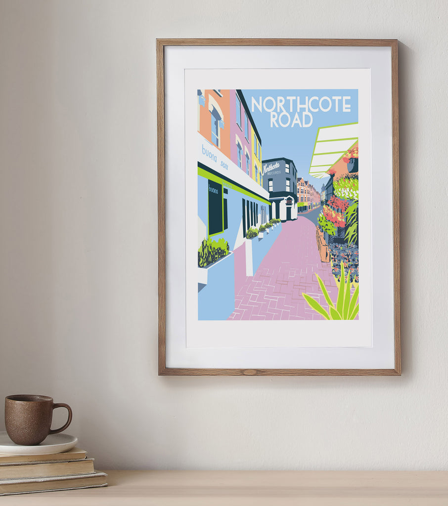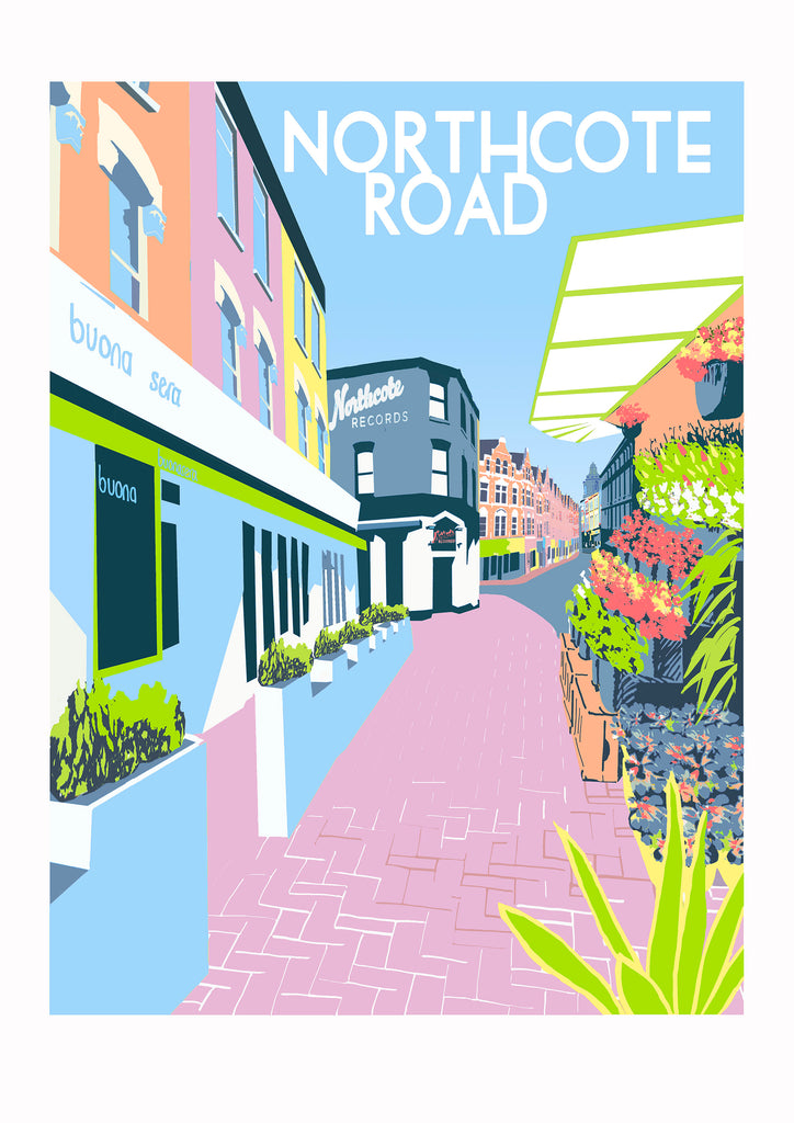 Signed and numbered run of 150 prints depicting the flower stall, Buona Sera restaurant, Northcote Records and shops of Northcote Road in a bold graphic, modern art style.
