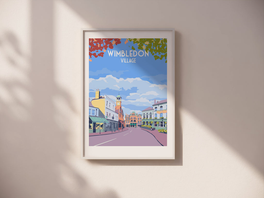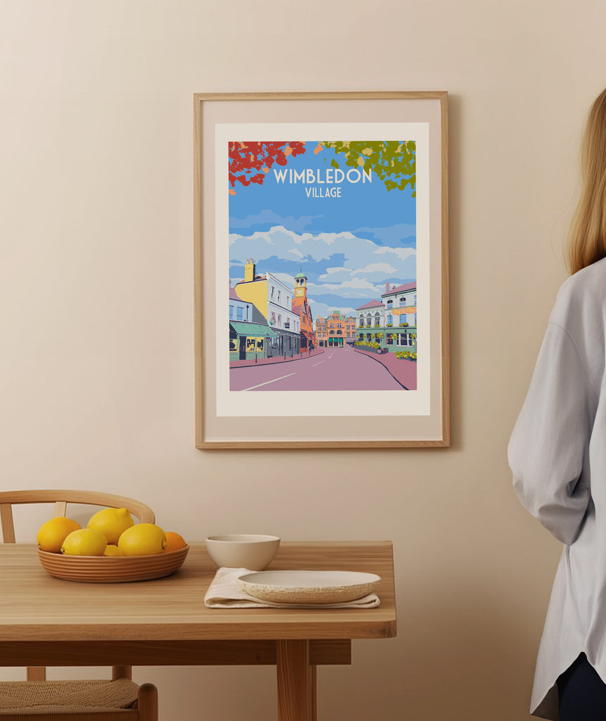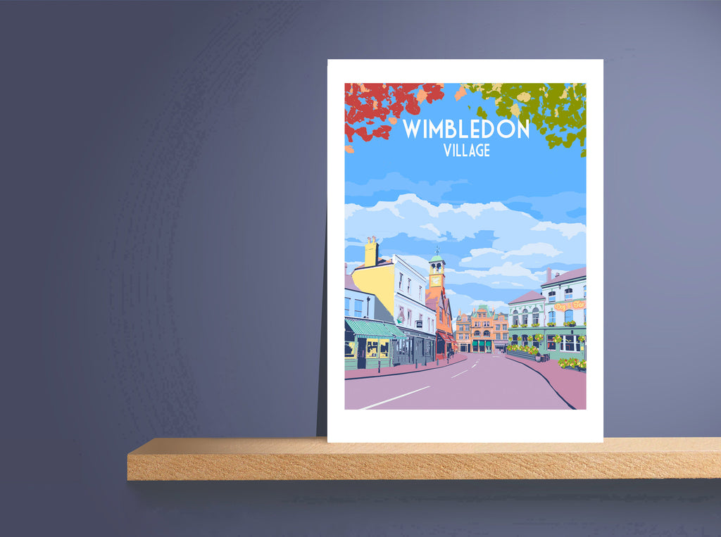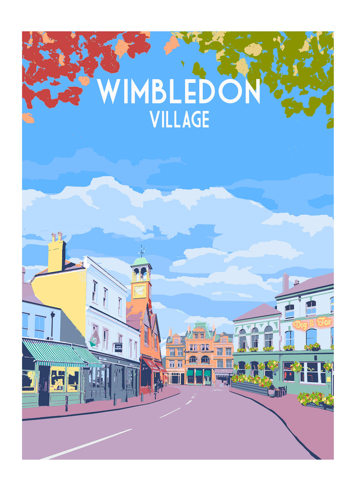 Limited edition fine art print of Wimbledon Village in a modern travel poster style.